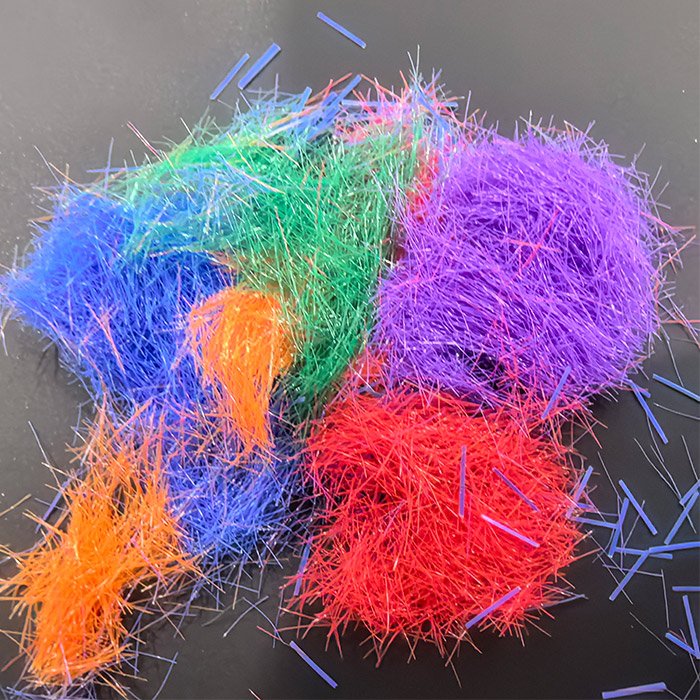 有(yǒu)色纤维丝 | 红、黄、蓝、绿、橙、黑、品等 | 10-100㎛ | 0.5-10MM | 聚酯 | 0.9-1.1 (25℃) | 直、弯曲 |