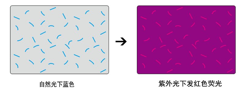 表面有(yǒu)色,紫外灯下更亮,如红-红、黄-黄、蓝-黄、绿-绿等颜色。或者表面一个颜色,紫外灯下一个颜色,如红变绿、蓝变绿等。