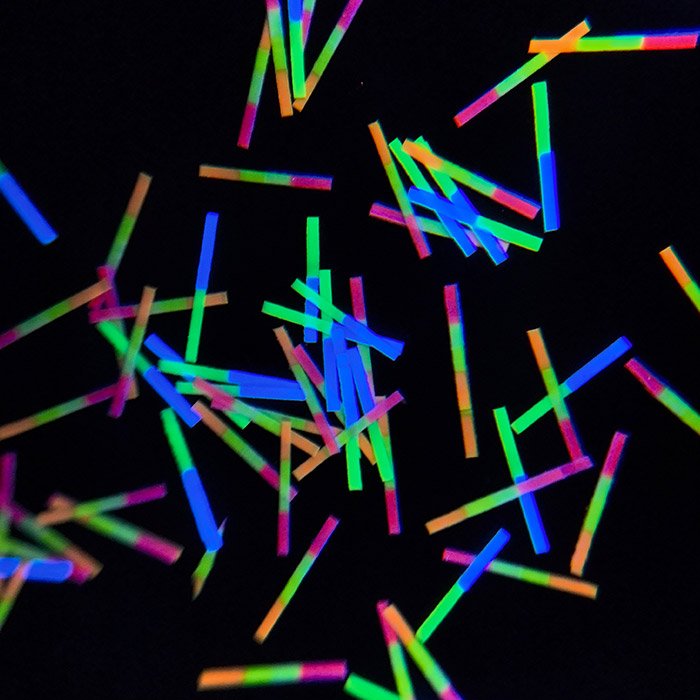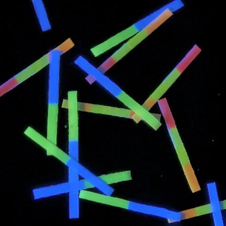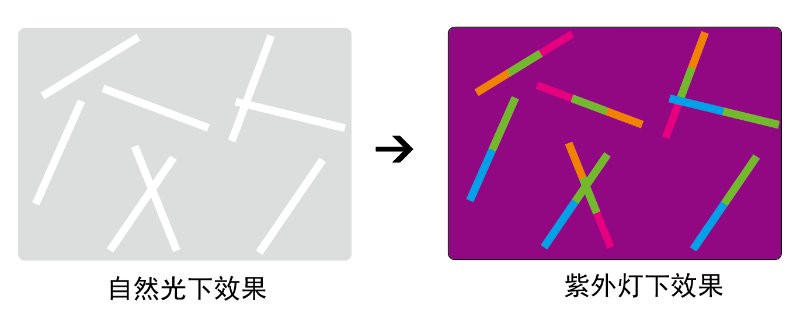 表面有(yǒu)色或者无色,在紫外灯下正面三色段,背面两色段,且荧光颜色不一样。每根位置、颜色统一。